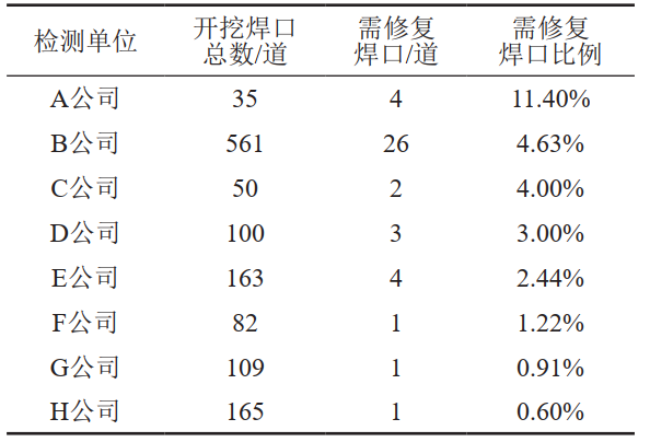 (4)按檢測單位分析,A公司、B公司的焊口需修復比例最高,分別為11.4%、4.63%,見(jiàn)表 6。