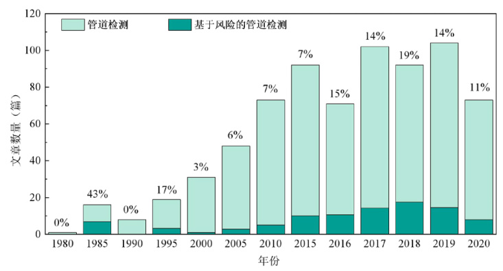 定期檢驗還可根據管道的損傷模式和風(fēng)險水平結合管道使用情況采用基于風(fēng)險的檢驗方法。近年來(lái),在行業(yè)專(zhuān)家及從業(yè)技術(shù)人員的不懈努力下,逐漸形成并完善了基于風(fēng)險的檢驗及完整性管理技術(shù)體系。如圖 1、圖 2所示,據全球文獻統計結果,自2010起,基于風(fēng)險的管道檢測研究占管道檢測研究總量的10%左右,且2018年占比高達19%;陲L(fēng)險的油氣管道相關(guān)研究占油氣管道相關(guān)研究總量的40%,標志著(zhù)基于風(fēng)險的管道檢驗與管道完整性管理理念的一致性已在全球行業(yè)范圍內達成共識,采用基于風(fēng)險的檢驗能更好地將檢驗工作與完整性管理相結合,是管道檢驗行業(yè)的一個(gè)發(fā)展趨勢[1]。我國新建及在役長(cháng)輸管道的基礎數據和運行管理數據齊全,經(jīng)過(guò)多次檢驗后獲取的檢驗數據完整,具備開(kāi)展基于風(fēng)險的檢驗條件。完整性管理是一種基于風(fēng)險的管理方式,本質(zhì)是通過(guò)風(fēng)險識別、檢驗和檢測、修復和風(fēng)險減緩等手段,將管道風(fēng)險控制在合理水平。在國家標準GB/T 37368―2019《埋地鋼質(zhì)管道檢驗導則》中也給出了基于風(fēng)險檢驗的流程和方法。