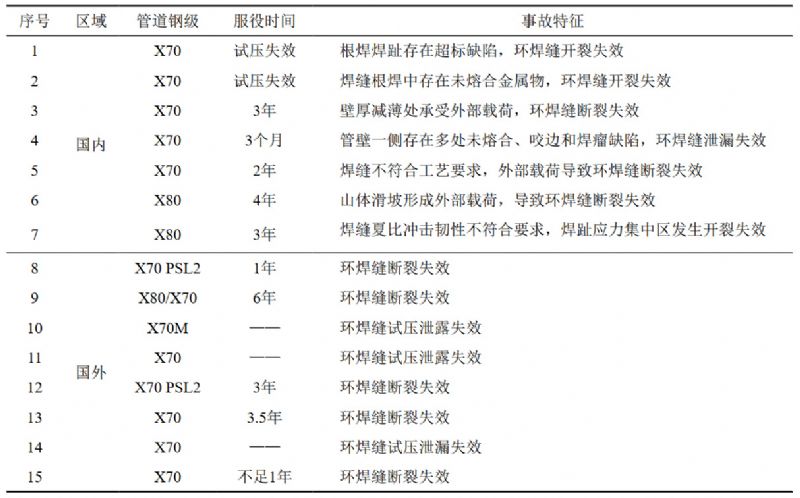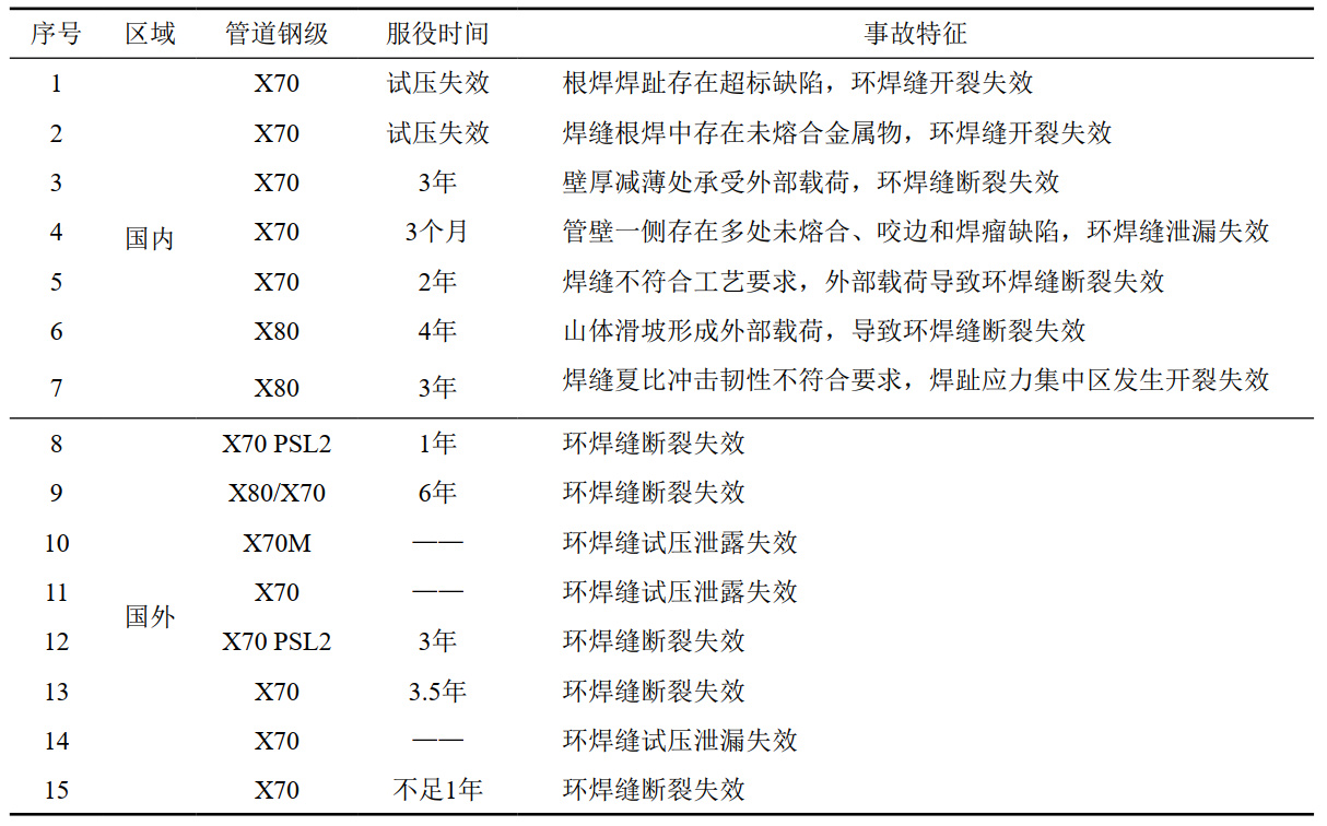 1 近年國內外高鋼級管道事故類(lèi)型及特征匯總