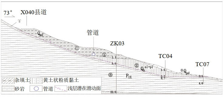 油氣長(cháng)輸管道作為線(xiàn)性工程往往要通過(guò)復雜多變的地質(zhì)環(huán)境,由于管道自身的結構特點(diǎn)和使用壽命等因素,地質(zhì)災害成為影響生產(chǎn)運行安全的一大因素。西氣東輸一線(xiàn)太行山GX005滑坡地質(zhì)災害位于沁陽(yáng)市黃沙嶺,距離市中心約15 km;麦w上部有X040縣道橫坡通過(guò),X040縣道沿坡體向下約30 m處為西氣東輸一線(xiàn)天然氣管道,管道沿坡體中上部橫向敷設,敷設長(cháng)度約為130 m,一旦發(fā)生滑坡可能造成管道變形甚至斷裂,嚴重影響管道運行安全。本文從災害特征分析、滑坡穩定性計算評價(jià)以及防治工程設計等方面入手,采取了有效預測和防治措施。