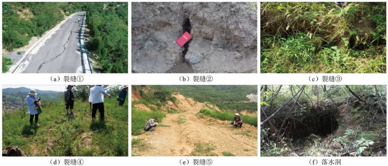 經(jīng)現場(chǎng)調查,滑坡體主要變形破壞特征為坡體出現如圖 3所示的裂縫及落水洞。在滑坡體上共發(fā)現5條裂縫,裂縫①位于后緣X040縣道路面上;裂縫②及裂縫③位于滑坡體南側坡體邊界上,均為縱向裂縫;裂縫④位于窯洞平臺土質(zhì)陡坎處,長(cháng)約30 m,寬度約10 cm~30 cm不等,可見(jiàn)深度約10 cm~30 cm;裂縫⑤位于坡體下部采坑人工堆渣邊坡頂部及道路上,長(cháng)約104 m,寬度2 cm~4 cm不等,深度約20 cm;滑坡體北側發(fā)現多處落水洞,直徑約0.2 cm~1.4 m,深約0.2 cm~1.7 m,裂縫及落水洞整體呈圈椅狀。根據現場(chǎng)調查及勘查成果分析,該滑坡處于緩慢變形階段,裂縫均由于滑坡變形引發(fā),其中裂縫①、裂縫④、裂縫⑤為拉張裂縫,裂縫②、裂縫③為剪切裂縫。
