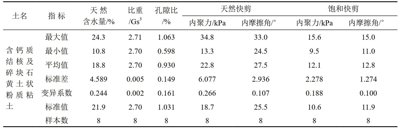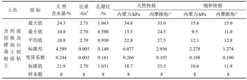 滑坡穩定性評價(jià)與計算中所采用的巖土物理力學(xué)參數的選取,是計算評價(jià)滑坡穩定性的關(guān)鍵所在。在滑體中采取土樣8件進(jìn)行室內試驗,結果統計見(jiàn)表 1。由于試驗土體中夾有大量鈣質(zhì)結核及碎塊石,而試驗時(shí)將其進(jìn)行剔除,導致試驗值產(chǎn)生一定偏差。因此根據現場(chǎng)勘查和室內土工實(shí)驗,坡體各地層的物理力學(xué)參數綜合取值如下表 2所示。