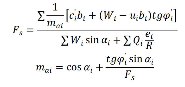 式中:FS為安全系數;mαi為第i個(gè)條塊的計算系數;αi  為第i個(gè)條塊底部的傾角;Wi為第i個(gè)條塊的重量;Ci為第i個(gè)條塊的粘聚力;bi為第i個(gè)條塊的長(cháng)度;ui為第i個(gè)條塊的孔隙水壓力;φ’i 為第i個(gè)條塊的有效內摩擦角;Qi為第i個(gè)條塊所受的水平向作用力;ei為第i個(gè)條塊所受的法向條間力;R為滑面半徑。