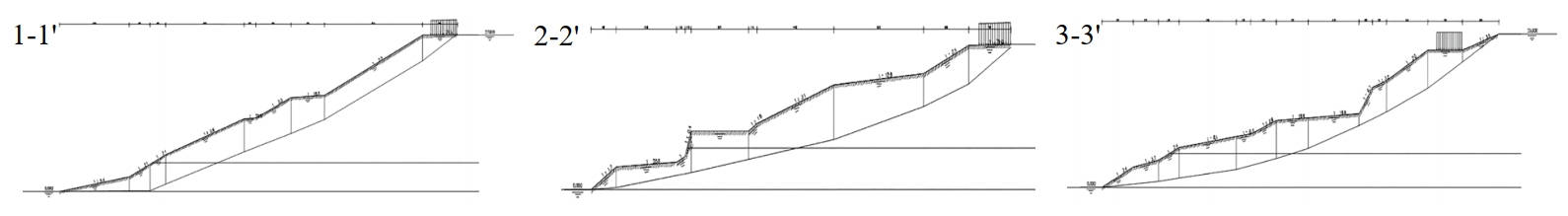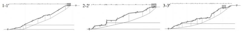 采用DZ/T 0218―2006《滑坡防治工程勘查規范》推薦的畢肖普條分法,根據滑坡地形地貌條件,對滑坡體各個(gè)潛在滑動(dòng)面分別進(jìn)行了穩定性分析計算;抡w選取1-1'、2-2'、3-3'三條剖面可能存在的潛在滑面進(jìn)行了穩定性計算。
