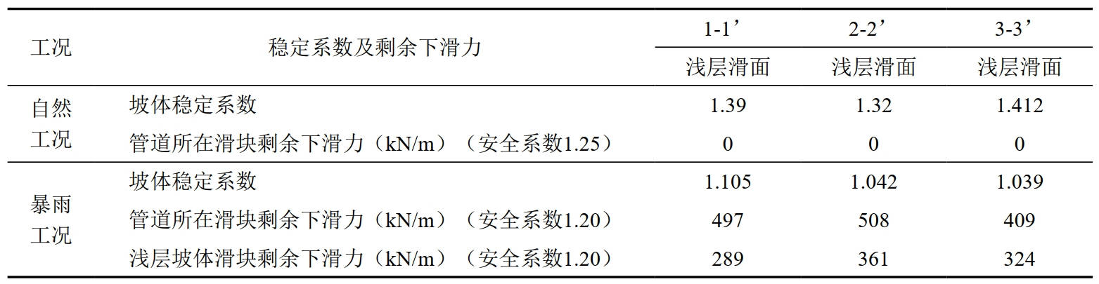 天然工況下各剖面的穩定性系數均在1.15以上,坡體及管道所在滑塊無(wú)剩余下滑力,說(shuō)明坡體淺層覆蓋層處于穩定狀態(tài);飽水工況下2-2'及3-3'剖面穩定性系數均低于1.05,管道所在滑塊剩余下滑力分別為497 kN/m、508 kN/m、409 kN/m,說(shuō)明在強降雨作用下淺層滑坡整體上處于欠穩定狀態(tài),為保障輸氣管道運營(yíng)安全,需采取治理工程進(jìn)行防治。
