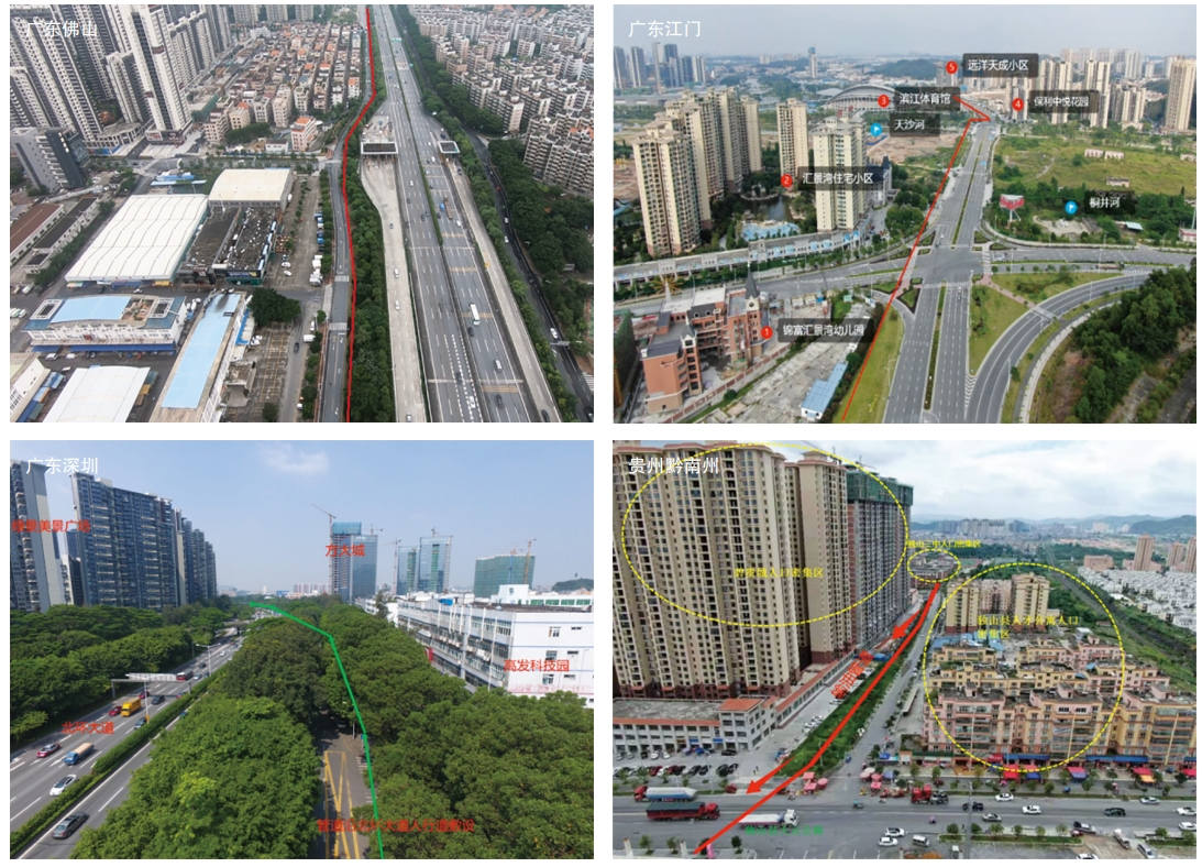 華南公司目前管轄廣東、廣西、貴州、云南、四川、重慶等6省市6000余公里成品油管道,2023年識別高后果區1163處、高后果區里程約1358公里,占比約22%,其中廣東地區高后果區總數540處、里程792公里,占比約43%,均明顯高于西南其他省市(圖 1);此外,廣東深圳、廣州、東莞、佛山、中山、珠海、江門(mén)、貴州黔南州、貴陽(yáng)等地區部分管道穿越城區,管道周邊密集分布大型住宅社區、寫(xiě)字樓等人員密集場(chǎng)所(圖 2),高后果區風(fēng)險管控難度大。