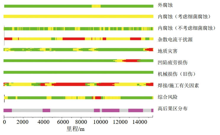 通過(guò)開(kāi)展“管道大摸底、隱患大排查、管理大提升”活動(dòng),全面完成內外檢測、地災排查、高后果區再識別等“體檢”,匯編成公司管道管理數據手冊、水系圖和事故案例集。完成了高后果區重點(diǎn)風(fēng)險因素梳理,開(kāi)展了以樁號/里程為基準的管道內外部重點(diǎn)風(fēng)險對齊和管道綜合風(fēng)險分析與評價(jià)。根據數據對齊和風(fēng)險評價(jià)結果,制作11項重點(diǎn)業(yè)務(wù)管理看板,采取“掛圖作戰”一表式推進(jìn)問(wèn)題整改。以坪山—媽灣為例,通過(guò)內外檢測雜散電流干擾、地質(zhì)災害、管道焊接/施工有關(guān)因素(管道底片)、管道第三方施工(機械損傷)等數據對齊(圖 3),識別出該段管道高后果區較突出的風(fēng)險為與焊接施工有關(guān)因素和雜散電流干擾因素。完成了高后果區范圍高失效可能性的23處環(huán)焊縫缺陷修復,對雜散電流干擾進(jìn)行了治理。針對處于高后果區的中等失效風(fēng)險,制定三年分級治理策略,逐年推行風(fēng)險降級。同時(shí),根據對齊結果,加強高后果區重點(diǎn)風(fēng)險的感知與預警,彌補人工巡檢時(shí)效性和可靠性不足的問(wèn)題。在高后果區中等失效可能的某閥室安裝部署無(wú)人機機庫,日?蛇M(jìn)行以閥室為中心點(diǎn)的4條線(xiàn)路巡檢,全面覆蓋9.7 km的重點(diǎn)高后果區,常態(tài)化全天候開(kāi)展16架次/天的巡檢工作,對第三方施工作業(yè)、地質(zhì)災害等異常目標實(shí)時(shí)識別和預警。