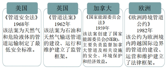 油氣管道業(yè)發(fā)達國家均十分重視油氣管道安全的立法,美國、加拿大、歐盟及英國等發(fā)達國家及組織先后對油氣管道行業(yè)開(kāi)展立法工作(圖 1)。