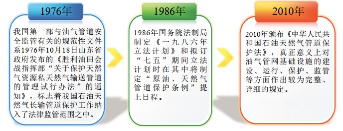 隨著(zhù)油氣管道的大規模建設,管道保護任務(wù)日趨繁重。安全法律法規體系也在逐步完善,初步形成以法律、行政法規、部門(mén)規章為主導,規范性文件為支撐,內容涵蓋安全生產(chǎn)、管道保護、應急處置、環(huán)境保護以及職業(yè)健康等領(lǐng)域的油氣管道安全法律法規體系框架。目前,我國油氣管道安全監管的法律監管框架呈現出由一部綱領(lǐng)性法律統領(lǐng),由一定數量的國務(wù)院及其各部委頒布的行政法規、部門(mén)規章、政府文件等規范性法律文件主導監管,由各地方政府頒布的規定、文件作為主力監管,由司法解釋及其它規定作為補充監管的格局。我國油氣管道代表性法律及立法歷程如圖 2所示。
