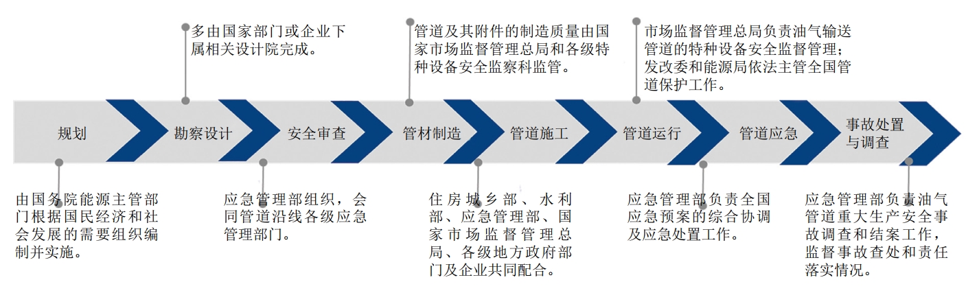 全生命周期的監管體系。管道的全生命周期包括了管道規劃設計、公共聽(tīng)證、管道勘察設計、管材制造、管道施工、管道運行、管道檢測、管道報廢、應急響應、事故調查和廢棄,如圖 3所示。同時(shí)管道的全生命周期開(kāi)展預評價(jià)、安全評價(jià)、環(huán)保評價(jià)、驗收評價(jià)、適應性評價(jià)等。