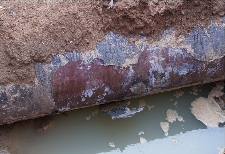 (1)管道防腐層破損。對事故管道開(kāi)挖發(fā)現瀝青玻璃布防腐層破損、脫落嚴重,管道外壁大面積直接暴露在自然環(huán)境中(圖 2)。在東黃復線(xiàn)管道建設期,尚未普及三層PE管道外防腐技術(shù),瀝青玻璃布防腐效果不佳。