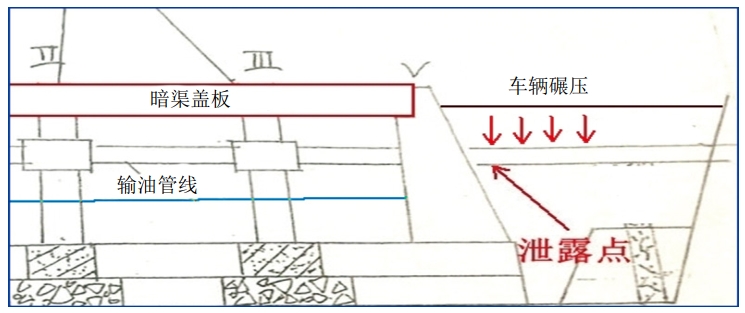 排水渠的建設在管道之后,由早期的明渠后來(lái)加蓋成為暗渠。排水渠在秦皇島路與齋堂島街的“丁”字路口處建設了橋涵,管道沿秦皇島路在橋涵蓋板下穿過(guò)水渠。根據施工說(shuō)明,在路口開(kāi)挖寬度為56 m、中部深度5.3 m的橋涵基坑,橋涵建成后填土掩埋橋涵外側管道。秦皇島路的建設也在管道之后,道路與管道相同路由,管道大部分在道路的隔離帶下方,但是路口處的管道不能避免車(chē)輛碾壓,尤其是在秦皇島路建設期間管道上方土層薄、施工車(chē)輛重對管道的損傷難以避免。在當年手繪的排水渠橋涵施工圖上后來(lái)又標注了暗渠蓋板、車(chē)輛碾壓和泄漏點(diǎn)等信息(圖 3)。