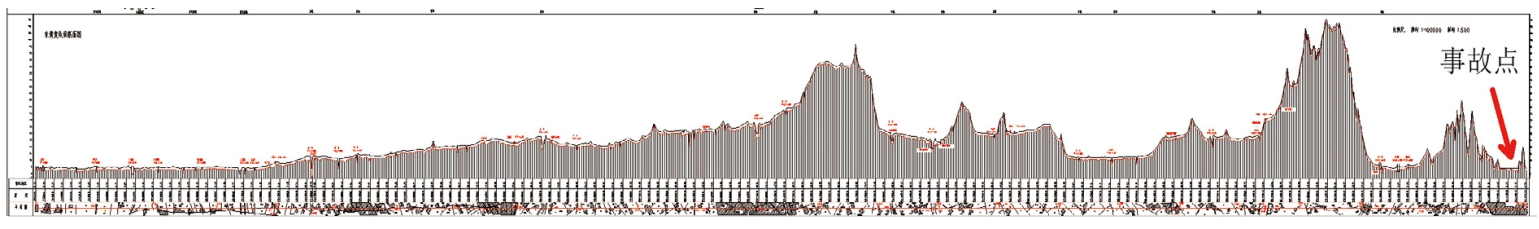 原因之三:壓力高、管壁薄。東黃復線(xiàn)于1986年7月建成投運,1991年9月通過(guò)竣工驗收[1,2]。該管道是我國首條采用大站距、變壁厚、密閉輸送工藝設計的原油管道[3]。管道原設計輸油方向是從東營(yíng)到黃島,設東營(yíng)首站、壽光熱泵站、丈嶺熱泵站、黃島末站,管道采用日本進(jìn)口的API5LX-60鋼管,管徑Ф711.2 mm,壁厚分別為8.74 mm、7.92 mm和7.14 mm三個(gè)級別,根據管道沿線(xiàn)壓力分布選擇管道壁厚,結果是出站端壁厚大、進(jìn)站端壁厚小,7.14 mm壁厚管道占總管長(cháng)的54.4%。1998年10月,管道改為從黃島向東營(yíng)方向輸送進(jìn)口原油,黃島油庫變?yōu)槭渍、東營(yíng)首站變成末站,停用了加熱爐[4],中間站變?yōu)椴剌斢驼、壽光輸油站。從管道縱斷面圖上(圖 4)可見(jiàn)事故點(diǎn)處海拔高度最低,緊鄰首站出站端,該處管內的壓力最高,而此處原設計是末站進(jìn)站端,管道壁厚最薄。由于壁厚的原因,管道反向輸送改造后,泵站最高出站壓力由原來(lái)的6.57 MPa降到4.67 MPa,輸油量由2000萬(wàn)噸/年下降到1000萬(wàn)噸/年。然而反輸改造后事故點(diǎn)處管內壓力較改造前增加了幾倍。