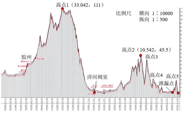 (2)停輸至洋河截斷閥關(guān)閉。從圖 9中可見(jiàn),高點(diǎn)1與泄漏點(diǎn)有超過(guò)100 m的高差,能造成泄漏點(diǎn)處0.8 MPa的管道內壓,停泵后回流的原油從事故點(diǎn)以較高的壓力噴泄,關(guān)閉洋河閥室能避免高程大于高點(diǎn)2的管內原油繼續泄漏,開(kāi)啟首站泄壓閥能回收部分從高點(diǎn)回流的原油。洋河閥室距黃島首站24.5 km,從停泵到關(guān)閥歷時(shí)66分鐘。