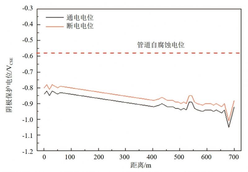依據GB/T 21447―2008《鋼制管道外防腐控制規程》6.6.2、GB/T 21448―2008《埋地鋼制管道陰極保護技術(shù)規范》4.3規定。測試管道通電電位、斷電電位均滿(mǎn)足﹣0.85 VCSE的最小保護電位指標或100 mV極化偏移指標。因此判斷管道事故點(diǎn)西側殘留管段以西700 m范圍內管道具備一定的陰極保護效果。