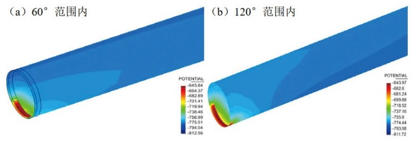 當防腐層破損處位于墻體內側30 mm~90 mm,分別處于管道下方60°和120°時(shí)管道外表面電位分布如圖 6所示。