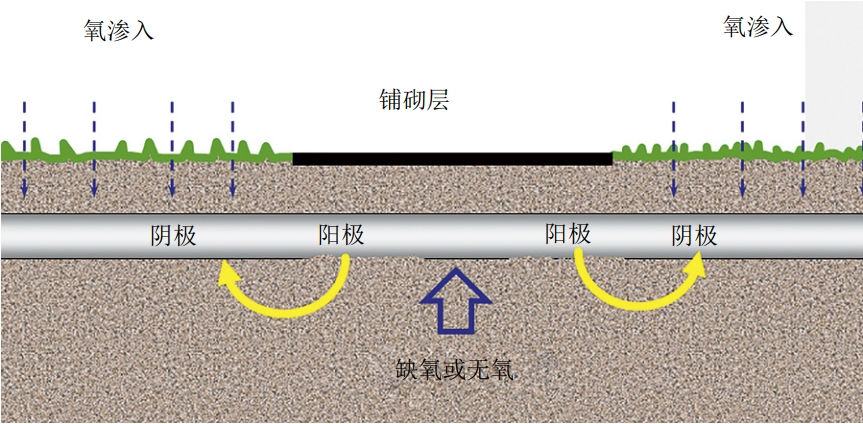 三是氧濃差電池導致管道距離墻體表面1 m之內腐蝕嚴重。管體穿越墻體界面靠近排污暗渠側氧含量較高,靠近墻體側氧含量較低,會(huì )在局部形成氧濃差腐蝕電池,加速缺氧位置處的腐蝕,從而導致墻體內側1 m范圍內局部腐蝕嚴重。這個(gè)類(lèi)似于穿越路面的管道由于氧濃差電池導致管道腐蝕,如圖 8所示。