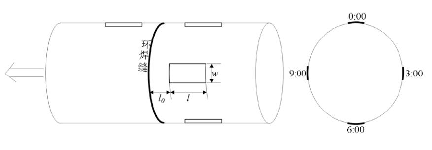 (1)應力檢測。第一次超聲波軸向應力檢測共測量了4處截面,截面位置如圖 1所示,每個(gè)截面上測點(diǎn)分布如圖 2所示,F場(chǎng)測量應力最大值位于截面④的0點(diǎn)鐘方向,承受340 MPa的拉應力,X65鋼材的屈服強度為450 MPa,強度比值為0.76。