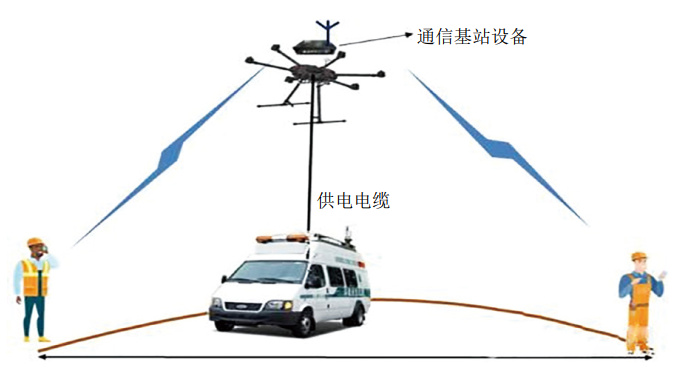 (1)擴大通信覆蓋范圍。應急救援現場(chǎng)環(huán)境復雜,各種樓宇、山丘等的遮擋直接影響了現場(chǎng)的通信傳輸及組網(wǎng)覆蓋范圍,極大地限制了應急通信的傳輸效果。隨著(zhù)無(wú)人機技術(shù)、通信組網(wǎng)技術(shù)的不斷發(fā)展和普及,使空中組網(wǎng)通信方式成為可能,有效擴大通信覆蓋范圍。系留無(wú)人機采用線(xiàn)纜供電,不受電池續航時(shí)間限制,可長(cháng)時(shí)間滯空懸停飛行,為救援現場(chǎng)提供穩定的中繼鏈路。利用系留式無(wú)人機將中繼設備或基站升至 100 m~200 m 高空,形成空中組網(wǎng)及空中覆蓋,從而使通信傳輸距離及覆蓋范圍擴大10倍以上。如圖 1所示。