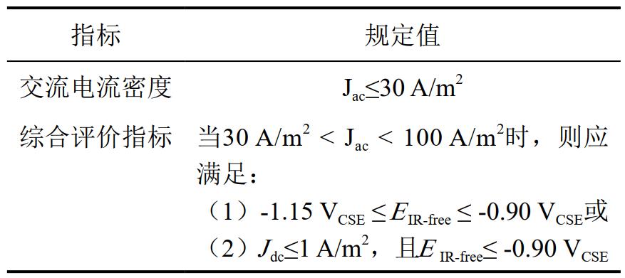 (2)SY/T 0087.6―2021《鋼質(zhì)管道及儲罐腐蝕評價(jià)標準 第6部分:埋地鋼制管道交流干擾腐蝕評價(jià)》標準中對交直流綜合指標進(jìn)行了規定,符合表 2中任一指標即可。在該評價(jià)指標中,所有值均為監測時(shí)段(一般為24小時(shí))內的平均值,標準中同樣未對動(dòng)態(tài)交流雜散電流干擾中可能會(huì )產(chǎn)生的偶發(fā)或頻發(fā)峰值進(jìn)行考慮。如表 2所示,采用另外一個(gè)數據記錄儀采集該測試樁處的斷電電位,最大值為﹣0.917 V,最小值為﹣1.095 V。應用此項評價(jià)指標進(jìn)行評價(jià),則此處無(wú)需采取排流措施。