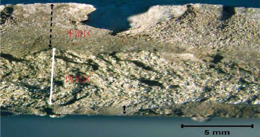 缺陷檢查。斷裂面由各光滑區域和粗糙表面組成,整個(gè)斷裂面的厚度各不相同。沒(méi)有證據表明存在制造缺陷。由于斷裂表面沒(méi)有人字紋,因此無(wú)法確定失效產(chǎn)生過(guò)程的確切位置(圖 3)。