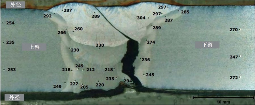 (4)硬度測試。對所有六個(gè)金相橫截面進(jìn)行了硬度測試,未發(fā)現異常高硬度的區域。失效環(huán)焊縫的硬度顯示出變化性,這可能與失效期間持續的冷外力有關(guān)。結果表明,與管體相比,焊縫金屬的硬度更低,焊縫存在低匹配的問(wèn)題。相鄰完好環(huán)焊縫的軸向拉伸試驗表明,其失效與實(shí)際斷裂相似,進(jìn)一步說(shuō)明了在施加軸向應力的情況下,焊縫處的硬度較低,是過(guò)載失效的首選位置(圖 4)。