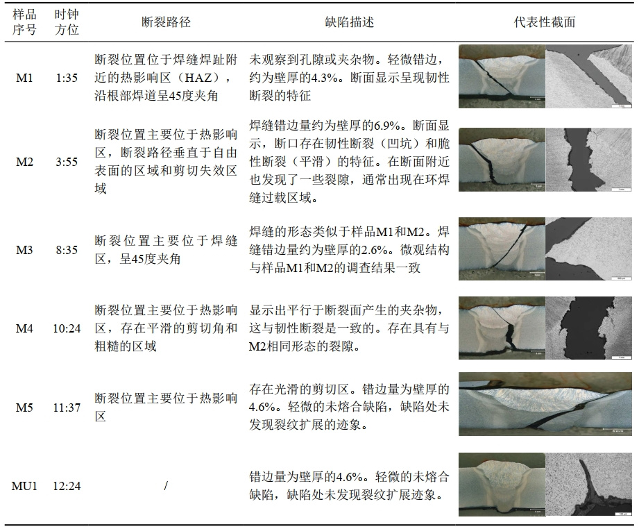 斷口形貌和金相分析。失效焊縫和相鄰完好焊縫取樣,斷口形貌和金相分析如表 1所示。同時(shí),通過(guò)掃描電子顯微鏡(SEM)沒(méi)有發(fā)現預先存在缺陷或疲勞的跡象,并觀(guān)察到了與韌性斷裂相關(guān)的凹坑及與脆性斷裂相關(guān)的平滑裂面的特征。