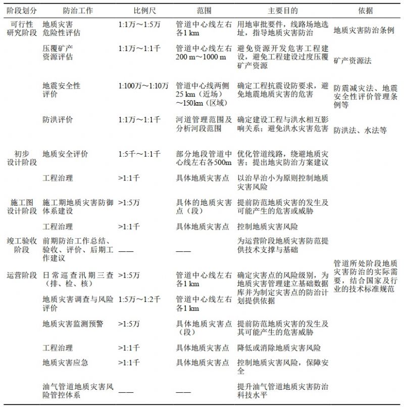 到2022年底,我國油氣管道總里程達18萬(wàn)千米,已基本形成連通海外、覆蓋全國、橫跨東西、縱貫南北、區域管網(wǎng)緊密跟進(jìn)的油氣管網(wǎng)布局!笆奈濉睍r(shí)期我國管道運輸仍將處于高速增長(cháng)期。與此同時(shí),近年來(lái)突發(fā)性強降水、臺風(fēng)等極端氣候事件增多,災害發(fā)生的概率加大,致使油氣管道面臨的地質(zhì)災害防治的總體形勢更加嚴峻。本文從油氣管道可行性研究、初步設計、施工圖設計、竣工驗收、運營(yíng)等五個(gè)階段入手,綜合研究油氣管道全生命周期誘發(fā)、加劇、遭受地質(zhì)災害威脅危害的可能性,避免和減少產(chǎn)生不良后果的基本方法,增強地質(zhì)災害防治的針對性、時(shí)效性和科學(xué)性,提高油氣管道建設及運行的地質(zhì)安全保障能力和水平(表1)。
