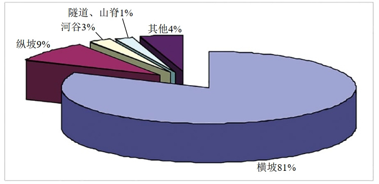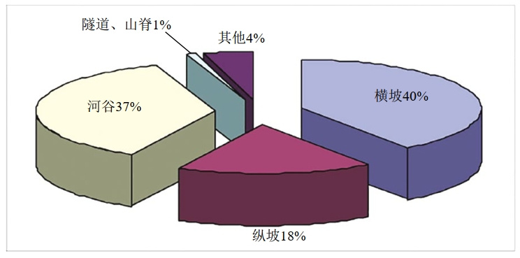 山區管道敷設方式可分為橫坡敷設段和縱坡敷設段,以澀寧蘭、蘭成渝、忠武和蘭鄭長(cháng)管道2005年至2010年排查出的4084處地質(zhì)災害為例,90%以上水毀災害發(fā)育在河道與山谷地區,崩滑流等其他災害則主要分布在山區橫坡敷設段(圖 1、圖 2)。