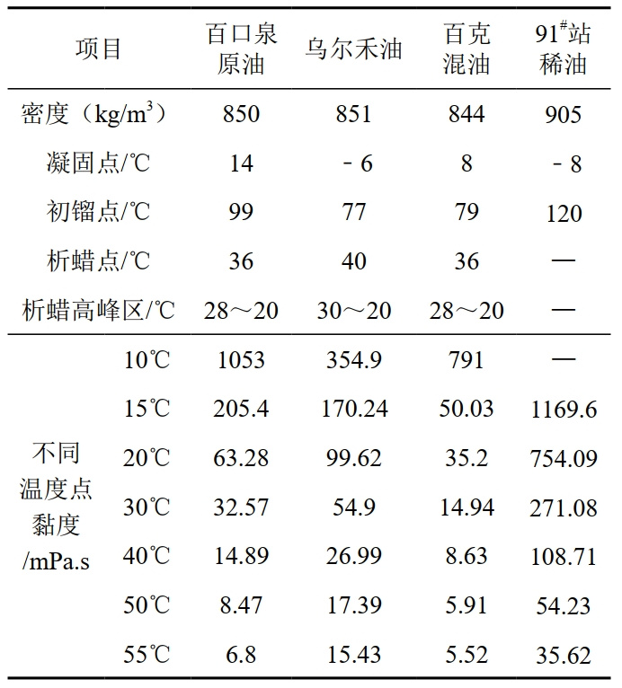 91#稀油處理站與百克線(xiàn)搭接點(diǎn)之間管道采用D114×4無(wú)縫鋼管全長(cháng)0.7 km。油品物性如表 1所示。