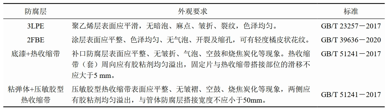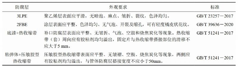 (1)管道防腐層外觀(guān)檢測與電火花檢漏。干式隧道穿越一般直管段為加強級3LPE,彎管段為雙層FBE,補口處采用環(huán)氧底漆+熱收縮帶,少部分干式隧道補口采用粘彈體+熱烤壓敏帶。按照GB/T 23257―2017、GB/T 39636―2020、GB/T 51241―2017各防腐層外觀(guān)要求如表 1所示。