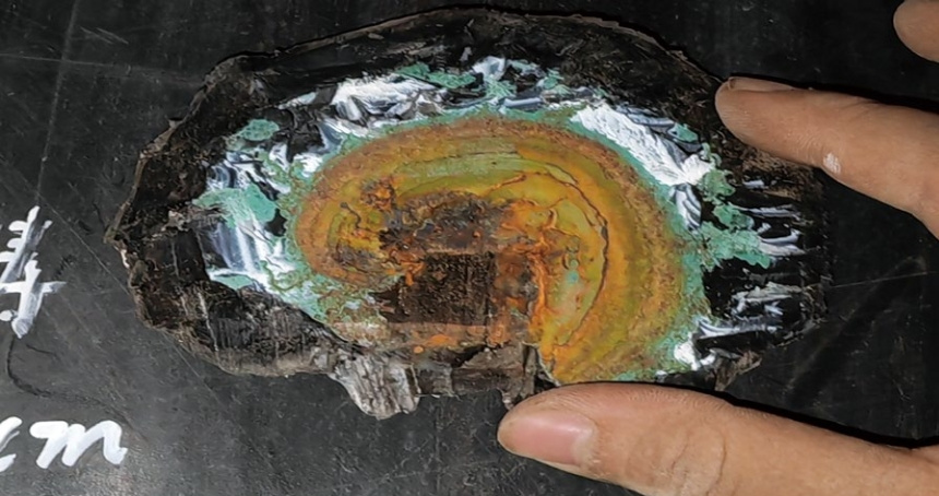 (1)檢測結果。大部分防腐層破損點(diǎn)位置以及被剝離的補口處均未發(fā)現明顯的管體腐蝕,僅個(gè)別防腐層破損點(diǎn)位置發(fā)生輕微銹蝕的情況,腐蝕深度不足0.01 mm,破損點(diǎn)處為均勻腐蝕(圖 5),腐蝕程度主要受防腐層狀況和隧道內環(huán)境濕度的影響。分析可能是腐蝕點(diǎn)位存在短暫空氣濕度相對較高和凝露的情況,形成了水膜,由于隧道大部分時(shí)間處于空氣濕度相對較低狀態(tài),水膜難以長(cháng)期存在,產(chǎn)生的浮銹具有隔離介質(zhì)的作用,故腐蝕深度不大。