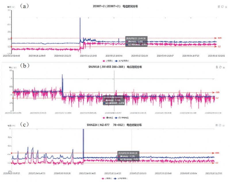 圖 3 a為SIM卡接觸不良問(wèn)題整改前后通斷電電位變化情況。SIM卡接觸不良,將導致電位數據無(wú)法正常傳輸,整改后,重新上傳數據。圖 3 b為重新標定采集儀前后通斷電電位變化情況。圖 3 c為更換采集儀前后通斷電電位變化情況,采集儀屬于智能測試樁的數據處理中樞,校準或維修后電位值恢復正常。