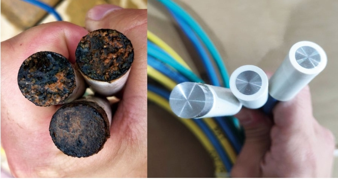 樁內連接線(xiàn)常見(jiàn)故障有接線(xiàn)頭銹蝕、測試線(xiàn)損壞以及接線(xiàn)問(wèn)題。日常管理中需要定期給接線(xiàn)柱和線(xiàn)頭進(jìn)行打磨處理,以確保接觸良好(圖 1)。事實(shí)證明,試片接線(xiàn)和參比接線(xiàn)的良好接觸以及是否松動(dòng)都會(huì )對設備檢測結果造成影響。圖 2 a為試片接線(xiàn)端打磨處理前后通斷電電位變化情況,圖 2 b為參比線(xiàn)重新連接前后通斷電電位變化情況。試片接線(xiàn)和參比接線(xiàn)失效,其后果等同于試片和參比失效(藍色線(xiàn)條為斷電電位,紅色線(xiàn)條為通電電位,下同)。