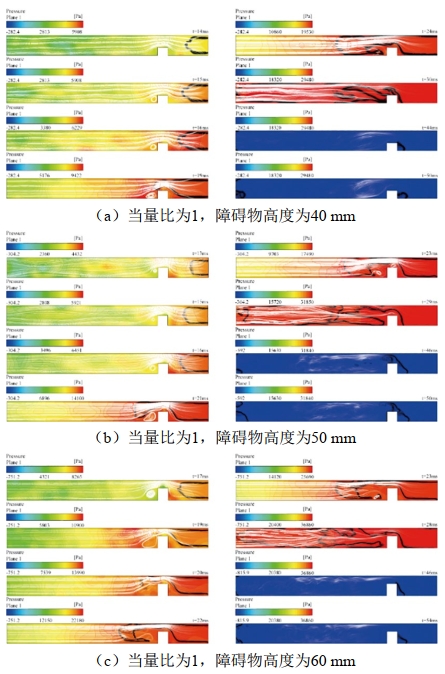 為了更好地分析不同高度障礙物對管道內火焰、壓力和流場(chǎng)的影響,通過(guò)數值模擬得到了不同時(shí)刻火焰—超壓—流動(dòng)區的流線(xiàn)耦合分布。該耦合分布與圖 1壓力曲線(xiàn)相結合,進(jìn)一步揭示了潛在的關(guān)系。在模擬的三種情況下初始火焰均以球形傳播,且垂直方向上面積很小,未接觸上下管壁。當火焰開(kāi)始出現指形傳播且未接觸障礙物時(shí),障礙物的后方就產(chǎn)生了渦流,但在火焰前沿幾乎不存在,并且障礙物高度越大,其后方的渦流范圍越明顯。當火焰面積開(kāi)始增加,Rayleigh-Taylor不穩定性和Kelvin-Helmholtz不穩定性變得更加明顯,火焰鋒面變得不穩定并變形,導致湍流增加。當障礙物高度為60 mm時(shí),爆炸峰值壓力為37.352 kPa,遠大于障礙物高度為40 mm和50 mm時(shí)的壓力。原因是內部湍流的增加加速了反應過(guò)程,釋放了更多的能量,從而增加了超壓。超壓值的增大加速了火焰的傳播(圖 2),當量比為1,障礙物高度為60 mm時(shí),火焰傳播速度明顯比障礙物高度為40 mm、50 mm快。特別是火焰鋒面在23 ms時(shí)越過(guò)障礙物,并在障礙物的后方和上方均產(chǎn)生了渦流,原因是氣流流動(dòng)速度的增大促進(jìn)了高速流動(dòng)剪切效應的發(fā)展,增加了Kelvin-Helmholtz不穩定性和渦量。且由于渦流的存在,使得火焰鋒面與障礙物之間形成不規則空洞。在管道內可燃氣體消耗完畢后,可觀(guān)察到有細小的火焰泡在管道中來(lái)回擺動(dòng),這是由于半封閉管道發(fā)生瓦斯爆炸后,氣室開(kāi)口端出現明顯的空氣回流現象,導致管道內外存在壓力差引起的,這也是實(shí)驗壓力在出現負壓后反復震蕩的原因。