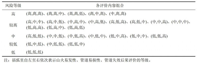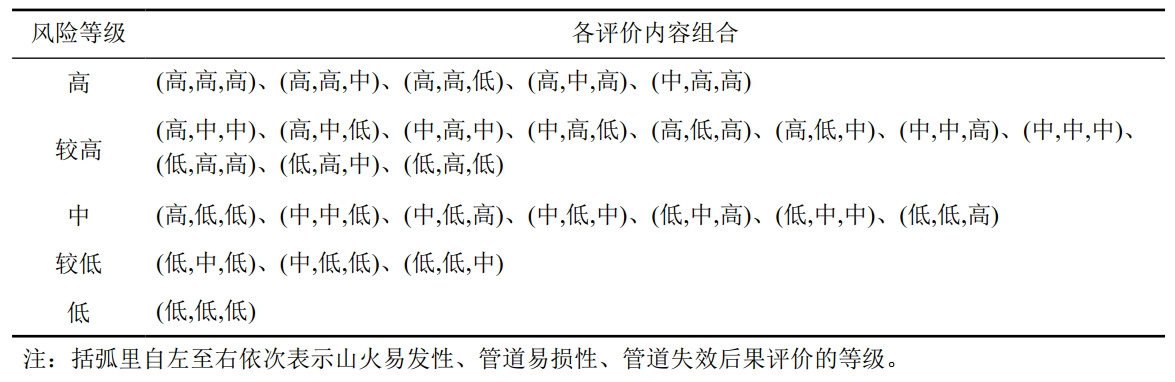 (5)山火風(fēng)險定性分級。綜合考慮山火易發(fā)性定性分級、管道易損性定性分級、管道高后果區定性分級結果,將天然氣管道山火風(fēng)險分為五個(gè)等級(表 4)。