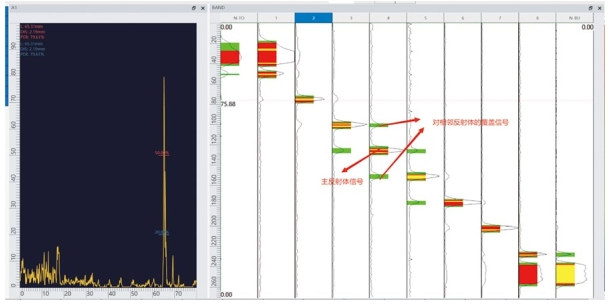 試塊調試時(shí)將不同分區的平底孔的波幅調整到80%滿(mǎn)屏高,以此作為檢測基準靈敏度,同時(shí)每個(gè)分區設置檢測閘門(mén),滿(mǎn)足檢測區域的同時(shí),限制其他影響評價(jià)的信號出現在檢測圖譜中,設置每個(gè)通道聚焦時(shí)要確保主聲束對相鄰反射有一定的覆蓋,以保證對分區間隙的檢測。