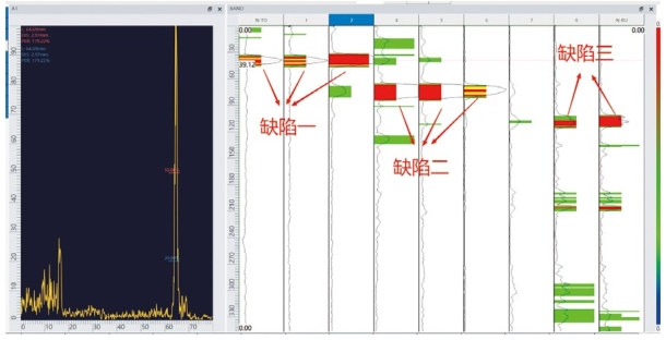 現場(chǎng)檢測圖譜中:缺陷一在圖譜中主要顯示通道為1和2通道,說(shuō)明該缺陷位于套筒側熔合區近表面,自身高度大于分區高度3 mm,缺陷長(cháng)度約15 mm;缺陷二在圖譜中主要顯示通道為4、5、6三個(gè)通道,說(shuō)明該缺陷位于套筒側熔合區中間部位,自身高度大于分區高度6 mm,缺陷長(cháng)度約15 mm;缺陷三在圖譜中主要顯示通道為8和根部槽通道,說(shuō)明該缺陷位于套筒側熔合區下表面,自身高度小于分區高度3 mm,缺陷長(cháng)度約15 mm。