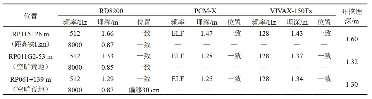 (2)驗證情況。采用RD8200(512 Hz和8k Hz)、PCM-X(低頻ELF)、VIVAX-150Tx(128 Hz)三種設備及不同頻率信號對光纜埋深、位置進(jìn)行復測及開(kāi)挖驗證(表 1),當采用RD8200(8k Hz)高頻信號時(shí),復測結果與實(shí)際開(kāi)挖埋深相差較大,且有一處位置偏移30 cm;當采用RD8200(512 Hz)、PCM-X(低頻ELF)、VIVAX-150Tx(128 Hz)低頻信號時(shí),復測結果與實(shí)際開(kāi)挖埋深比較一致。