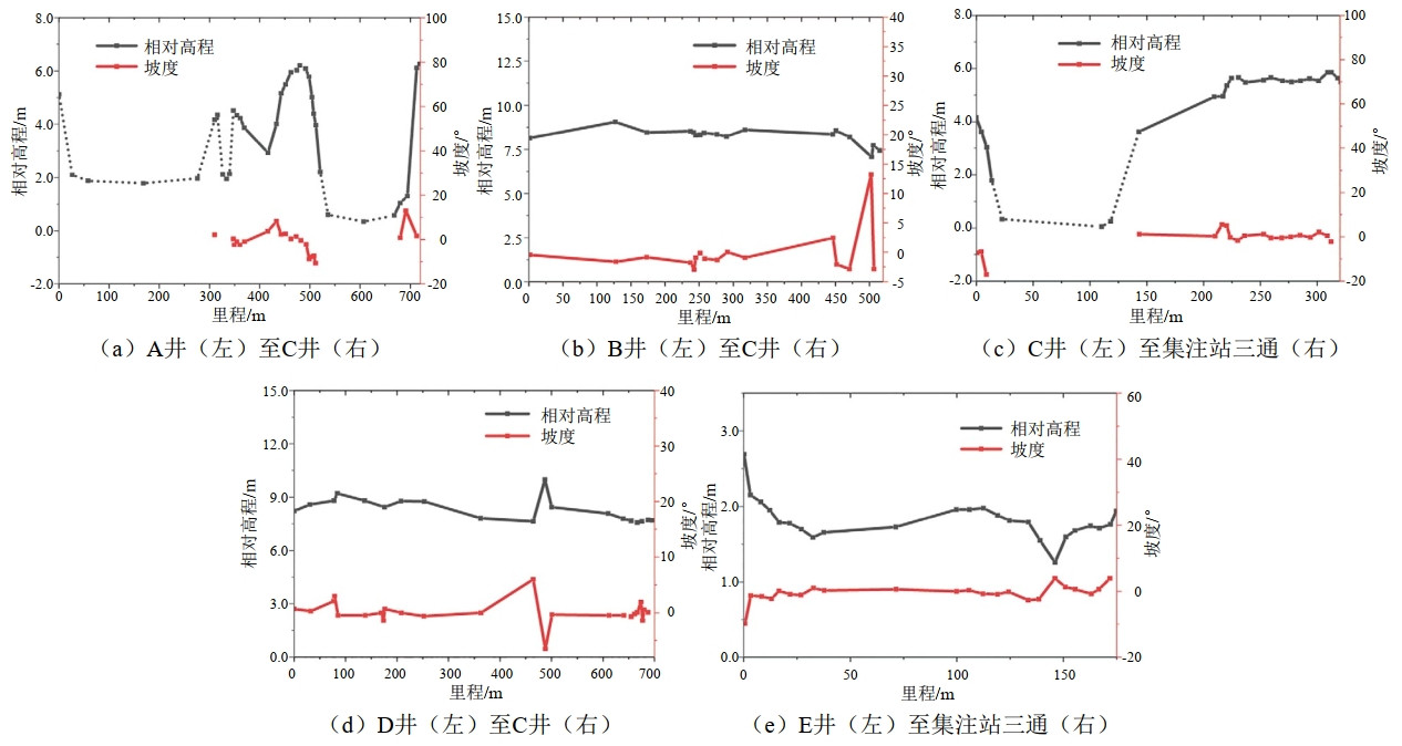 圖 1 某天然氣集輸管線(xiàn)相對高程、坡度-里程圖
