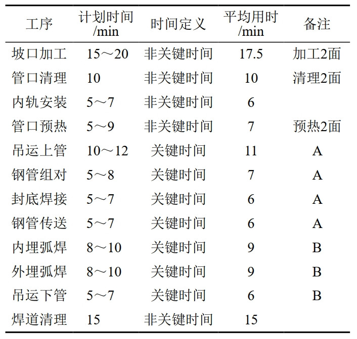 現場(chǎng)移動(dòng)雙連管預制作業(yè)中,吊運上管、鋼管組對、根焊、鋼管傳送為A關(guān)鍵時(shí)間單元,傳送時(shí)間為30分鐘;內埋弧焊、外埋弧焊、吊運下管為B關(guān)鍵時(shí)間單元(表 1),施工工效主要取決于A(yíng)段時(shí)間環(huán)節。單日的預估工效:8 h×60 min÷30 min/道=16道焊口。預計綜合工效提高約50%,雙連管焊接合格率98.61%。