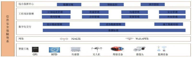 根據工程建設范圍,按照施工進(jìn)度、質(zhì)量和安全管控要求,構建方案整體架構,包括智能工地、數字化交付、工程項目管理、綜合指揮中心四部分(圖 1)。