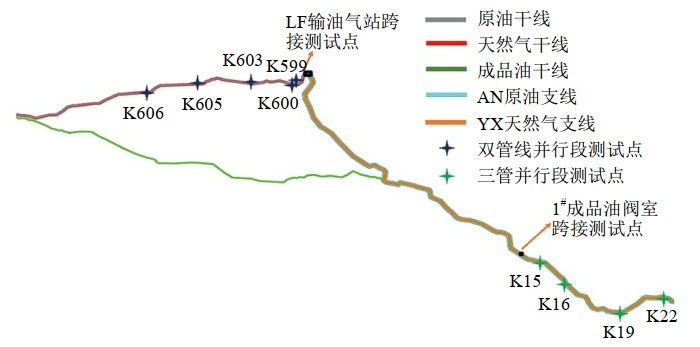 研究還針對西南山區某油氣并行管道干擾情況進(jìn)行電跨接實(shí)驗現場(chǎng)測試,跨接點(diǎn)和沿線(xiàn)電位監測點(diǎn)(圖 1)以某油氣管道K606到K22段為研究對象,在LF輸油氣站以及1#成品油閥室進(jìn)行跨接實(shí)驗,對跨接后的并行管道測試評價(jià)方法適用性進(jìn)行分析。