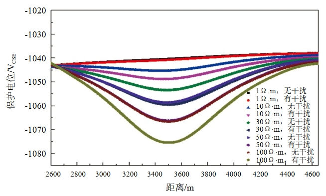 圖 4 不同土壤電阻率在有無(wú)干擾情況下保護電位分布