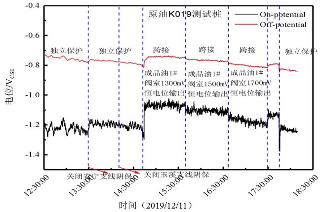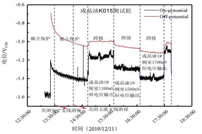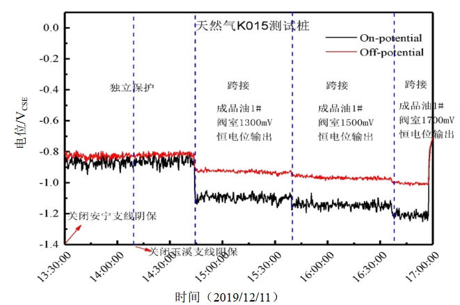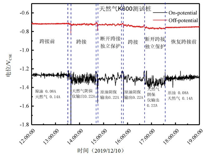(5)天然氣陰極保護系統輸出時(shí)通電電位波動(dòng)幅度大于各陰極保護系統獨立輸出時(shí)通電電位波動(dòng)幅度,大于原油干線(xiàn)陰極保護系統輸出時(shí)通電電位波動(dòng)幅度,表明C站干線(xiàn)陰極保護之間相互干擾主要是由于天然氣陰極保護系統引起的。