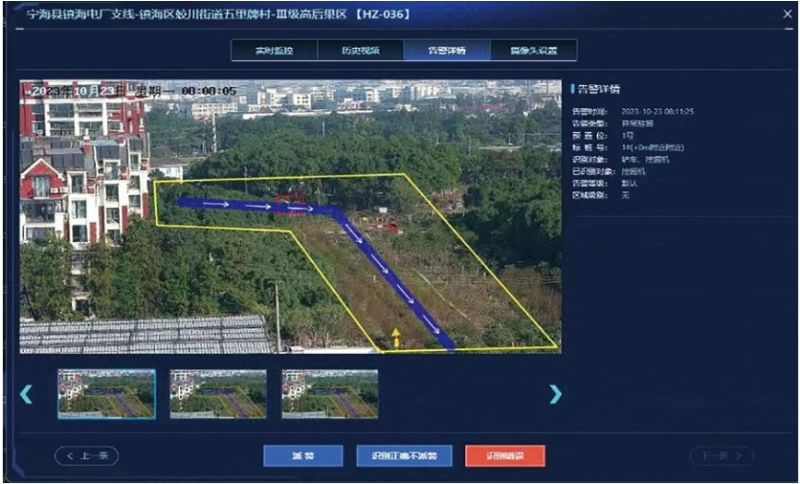(5)實(shí)施智能監控。每處高后果區均設置有智能攝像頭對管道周邊情況進(jìn)行實(shí)時(shí)監控,Ⅲ級高后果區另外設置鐵塔視頻監控,運維單元設有實(shí)時(shí)管理平臺,監控系統按照管道保護范圍設置10 m寬度的電子圍欄(圖 3),對進(jìn)入電子圍欄范圍內的機械作業(yè)即刻推送報警信息至該專(zhuān)職巡線(xiàn)人員的手機App上。高后果區內第三方施工頻繁區域還安裝有斷線(xiàn)報警器等技防設備。