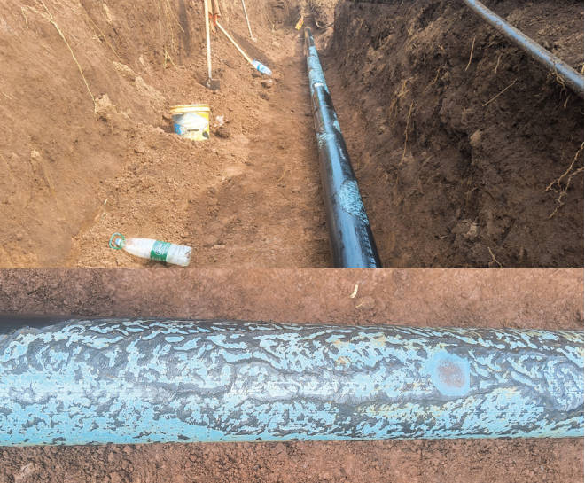 2025年7月,公司在蓮花支線(xiàn)外防腐層檢測中發(fā)現一處70 dB的防腐層缺陷點(diǎn)信號,同步對該段CIPS測量的陰保數據進(jìn)行分析,表明此處陰極保護電位顯著(zhù)偏正(圖 3)。經(jīng)開(kāi)挖長(cháng)約13m管道,顯見(jiàn)其中8 m左右的管道防腐層受損,面積達1.9 m2(圖 4)。開(kāi)挖過(guò)程中發(fā)現與管道平行分布有竹鼠洞穴,并且在土壤中散落大量環(huán)氧粉末底漆碎末,且防腐層破損邊緣呈現明顯的竹鼠啃咬齒痕。經(jīng)采用“粘彈體+冷纏帶”的方式對該段防腐層進(jìn)行修復,對暴露出來(lái)的硅管用角鋼進(jìn)行包裹,并在回填的土壤里和經(jīng)過(guò)竹林的管段周邊灑上驅鼠藥劑。一段時(shí)間后再次對該段管道進(jìn)行外防腐層檢測,未發(fā)現新的防腐層缺陷點(diǎn)信號。