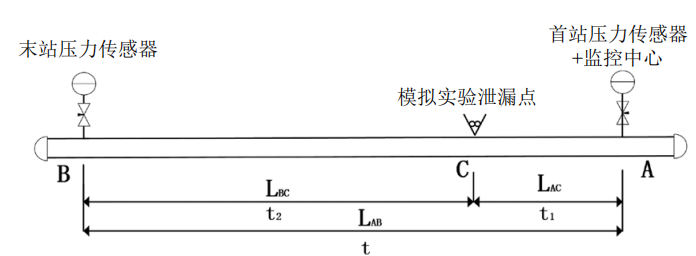 根據泄漏產(chǎn)生的波,負壓波的傳播速度以及管道兩端壓力傳感器監測到負壓波到達首末站的時(shí)間差,就可以確定泄漏的位置(圖 1)。