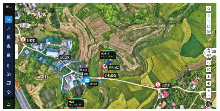 智能巡飛體系是應急現場(chǎng)信息獲取能力的關(guān)鍵補充。依托地理信息平臺,指揮中心或操作員可預先規劃多架無(wú)人機的自動(dòng)化巡飛航線(xiàn),并設定關(guān)鍵位置的懸停點(diǎn)與鏡頭參數。如分別部署航線(xiàn)持續監控泄漏核心區、追蹤河流污染帶擴散態(tài)勢、巡查主要救援通道保障通行安全等(圖 4)。