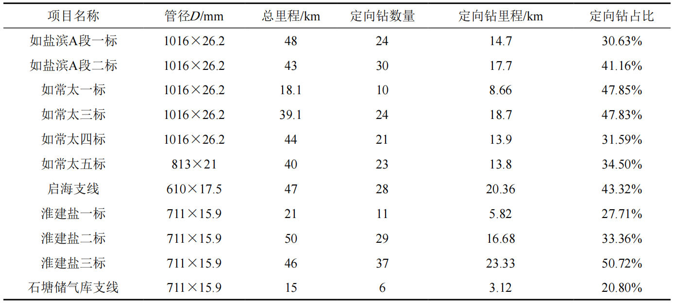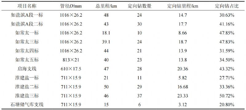 表 1 江蘇沿海管道建設各標段定向鉆工程統計表